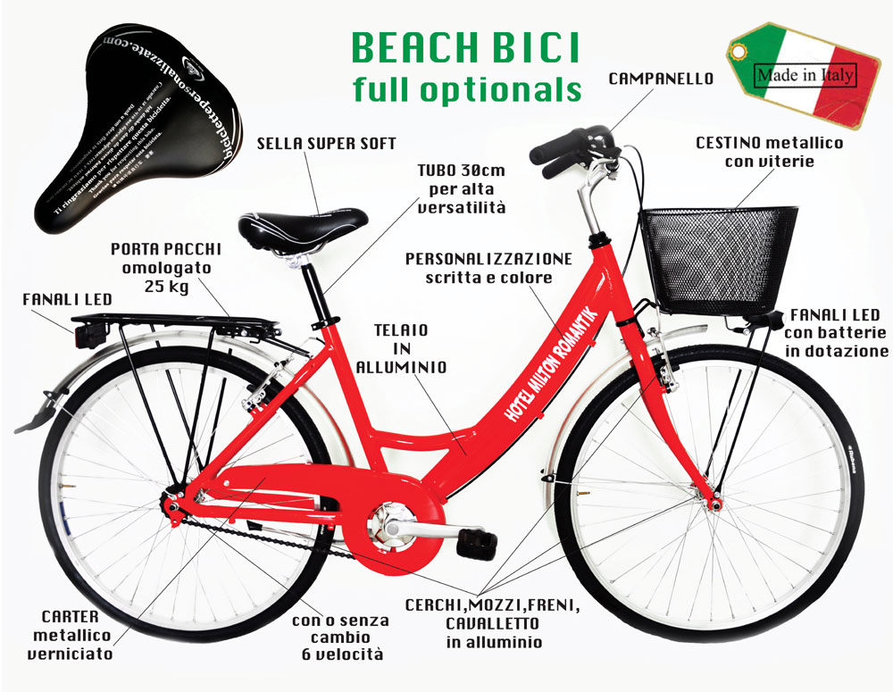 Unisex e massima versatilità perché regolando la sella con l'apposito gancio è adatta a stature da 120 cm a 190 cm. Cerchi e gomme rinforzati Telaio in alluminio rinforzato per essere leggero e resistere al salso Pedali rivestiti in gomma antiscivolo Senza cambio (possibilità di averlo su richiesta) Cavalletto in alluminio Fanali a Led ant/post a batterie(in dotazione)senza nessun filo Cestino anteriore (opzione a pagamento su richiesta) Portapacchi posteriore omologato fino a 25kg